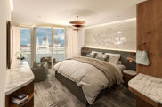 в каюте панорамное окно во всю стену одним нажатием кнопки опускается, образуя балкон; кровать размера king-size с постельным бельем премиум-класса (возможность установки двух односпальных кроватей по запросу), просторная ванная комната со шкафчиками для хранения вещей и душевой кабиной, банные принадлежности премиум-класса, банные полотенца, халаты и тапочки премиум-класса, фен премиум-класса, мини-бар (напитки и закуски при посадке, без пополнения), фильтрованная вода в каюте, жедневная уборка каюты и подготовка постели ко сну.