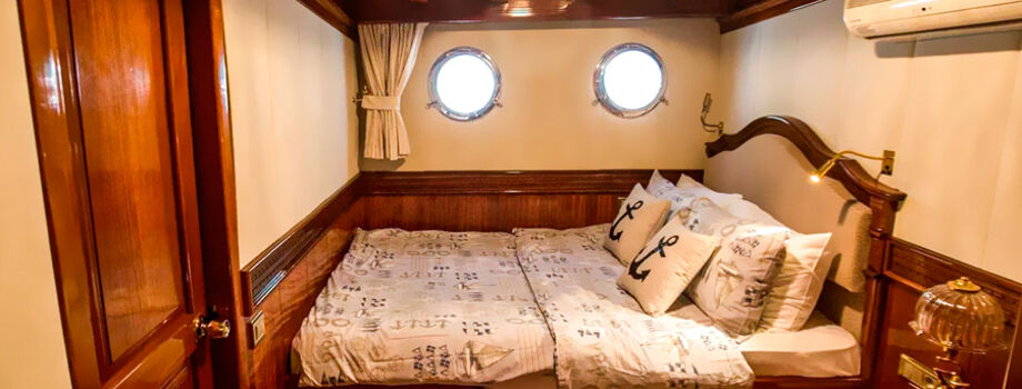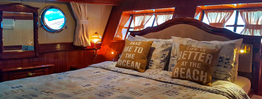 - 17 кают со всеми удобствами (в каждой каюте двуспальная кровать (не раздвигается), прикроватная тумбочка, шкаф для одежды, ванная комната, фен, розетки 220V, кондиционер).