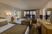 в каюте с большим панорамным раздвижным окном в спальной зоне большая кровать, в гостиной зоне диван, кондиционер с индивидуальным управлением, спутниковое телевидение, сейф, мини-бар (оплачивается дополнительно), ванная комната с душем, фен, розетки 220 В.