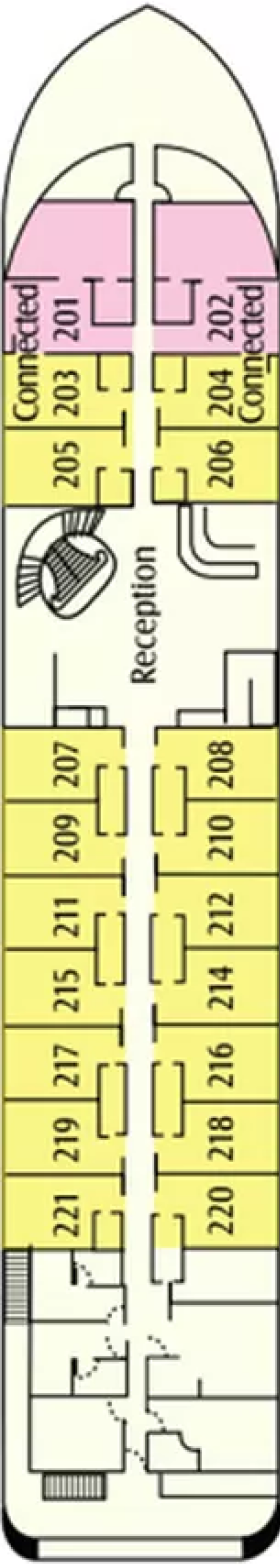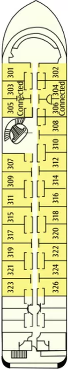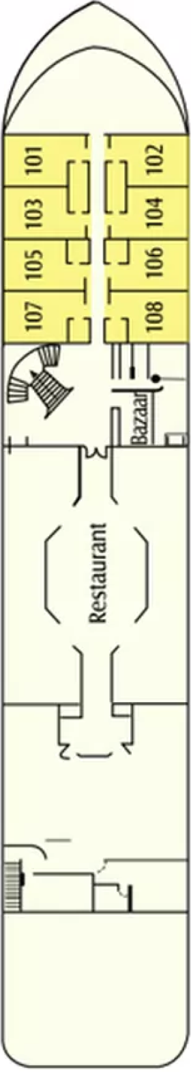 в каюте с окном две кровати, кондиционер с индивидуальным управлением, спутниковое телевидение, сейф, мини-бар (оплачивается дополнительно), туалет, ванная комната с душем, фен, розетки 220 В.
