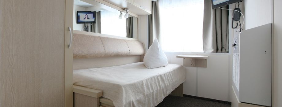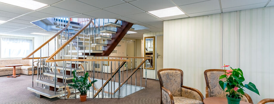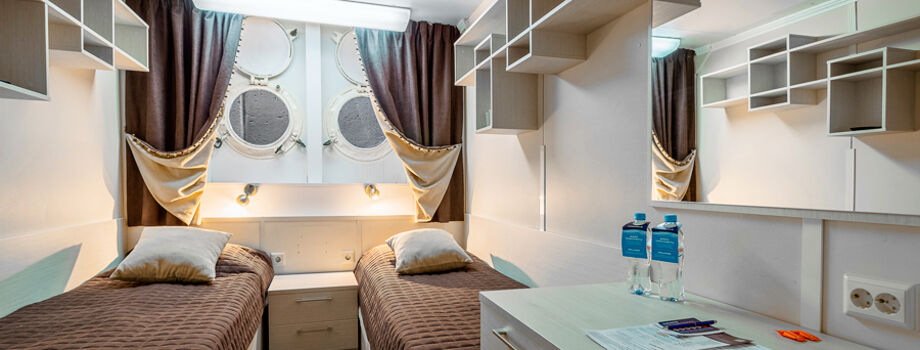 Гостям предлагаются: 34 просторные каюты категории «Полулюкс» (14 из них с индивидуальным балконом); 66 двухместных и 11 одноместных кают «Комфорт» с современным дизайном, мебелью и отделкой; 2 двухместные и 4 трехместные одноярусные каюты на нижней палубе. В каждой каюте теплохода есть кондиционер, холодильник (или мини-бар в каютах категории «Полулюкс»), ТВ и бесплатный Wi-Fi (при наличии технической возможности).