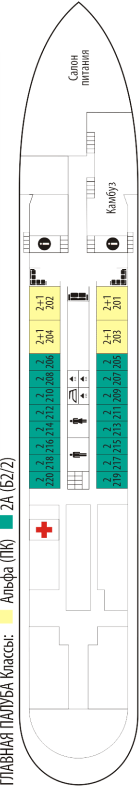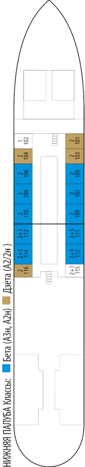 Двухместная каюта повышенной комфортности со всеми удобствами, расположенная на шлюпочной палубе. Возможно размещение третьего человека на дополнительном месте – кресло-кровать. В каюте: две односпальные кровати, ванная комната (раковина, душ, туалет).