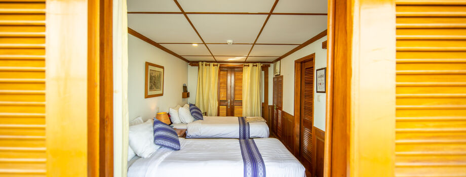Несмотря на небольшие размеры, на борту Kalay Pandaw, есть все для комфортного пребывания. Каждая каюта оснащена всем необходимым для удобного проживания: ванная комната с душем, гардероб, письменный стол, сейф, кондиционер, фен, полотенца, халаты и тапочки. Перед каждой каютой выделена собственная зона отдыха с плетеными креслами.