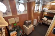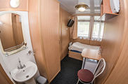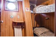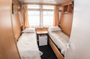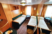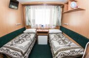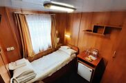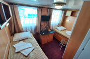 в каюте с окном односпальная кровать, кондиционирование, шкаф, холодильник, телевизор, тумбочка, радио, эл.розетка, санузел (умывальник, душ, туалет) Каюты на шлюпочной (№ 300), средней (№ 219, 220а, 220б, 222, 224) и главной (№ 122) палубе.