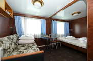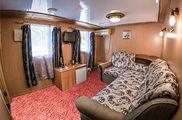 в каюте с 2-мя окнами двуспальная кровать, раздвижной диван (спальное место 1,9 х 1,4 м), шкаф, кондиционер, холодильник, телевизор, радио, эл.розетка, санузел (умывальник, душ, туалет). Каюты № А, Б.