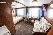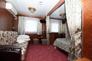 в каюте с 2-мя окнами двуспальная кровать и диван (в каюте №302 - 3 односпальных дивана), кондиционирование, шкаф, стол, холодильник, телевизор, радио, эл.розетка, санузел (умывальник, душ, туалет). Каюты на шлюпочной (№ 302 - особая планировка) и средней (№ 211, 213, 214, 215, 215а, 216, 218) палубе.