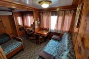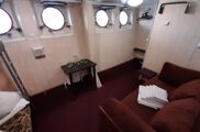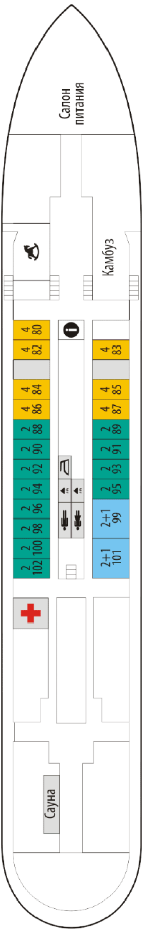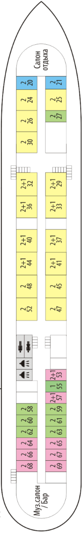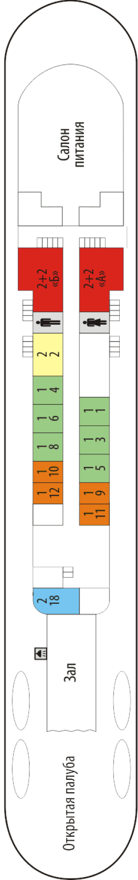 в однокомнатной каюте 2 окна, две 1-спальных кровати и 2-спальный диван, 2 кресла, шкаф, электрочайник, радио, туалет, ванная, умывальник, кондиционирование, мини-холодильник. Каюты расположены на шлюпочной палубе (№ А, Б).