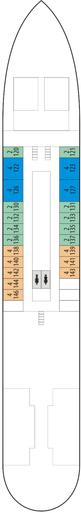 в каюте окно, две односпальные кровати, ванная комната с душем, туалетом, умывальником, шкаф для одежды, кондиционирование, мини-холодильник, радио, электрическая розетка. Каюты расположены на главной палубе (99, 101), на средней палубе (№ 20, 21), на шлюпочной (№ 18) палубе. В каютах 99 и 101 раскладной двуспальный диван и односпальная кровать.