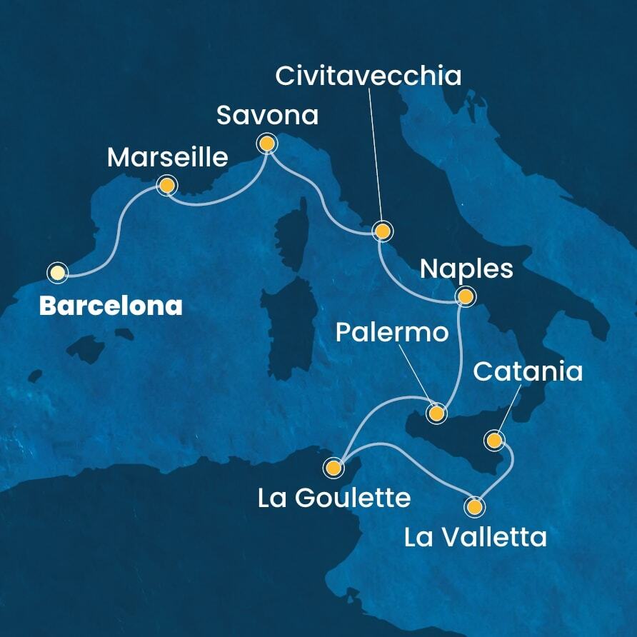 Средиземноморье, 8 ночей Круиз из порта Барселона, Испания в порт Катания, о. Сицилия, Италия