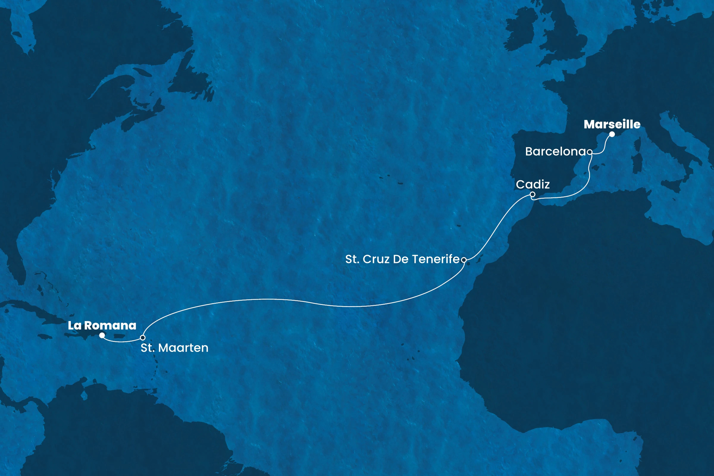 Репозиционные круизы из Америки в Европу, 14 ночей Круиз из порта Ла-Романа, Доминиканская Республика в порт Марсель, Франция