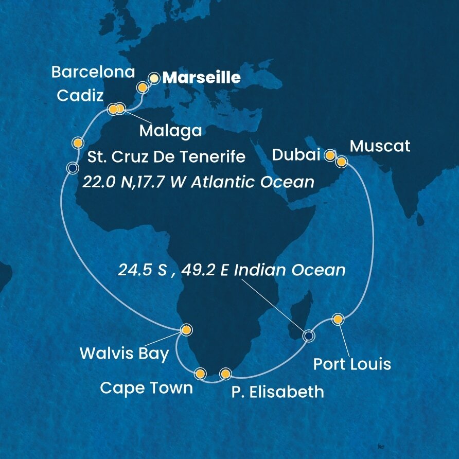 Африка Атлантическое побережье, 36 ночей Круиз из порта Марсель, Франция в порт Дубай, ОАЭ