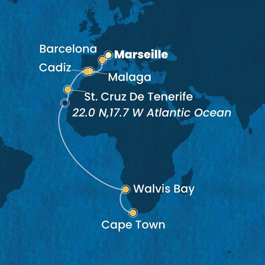 Африка Атлантическое побережье. Начните незабываемый Атмосферный морской круиз 13.11.2026 с Costa Cruises на борту лайнера Costa Smeralda. Начало путешествия 13.11.2026 из порта Марсель, Франция. За 20 ночей вы насладитесь высоким уровнем сервиса, комфортом и атмосферой настоящего морского приключения. За это время вы посетите Малага, Испания и Санта-Крус-де-Тенерифе, о. Тенерифе, Испания, прежде чем завершить круиз в порту Кейптаун, ЮАР 03.12.2026. Сбалансированная кухня, развлечения на борту и фирменное качество Costa Cruises сделают ваше путешествие ярким и запоминающимся.