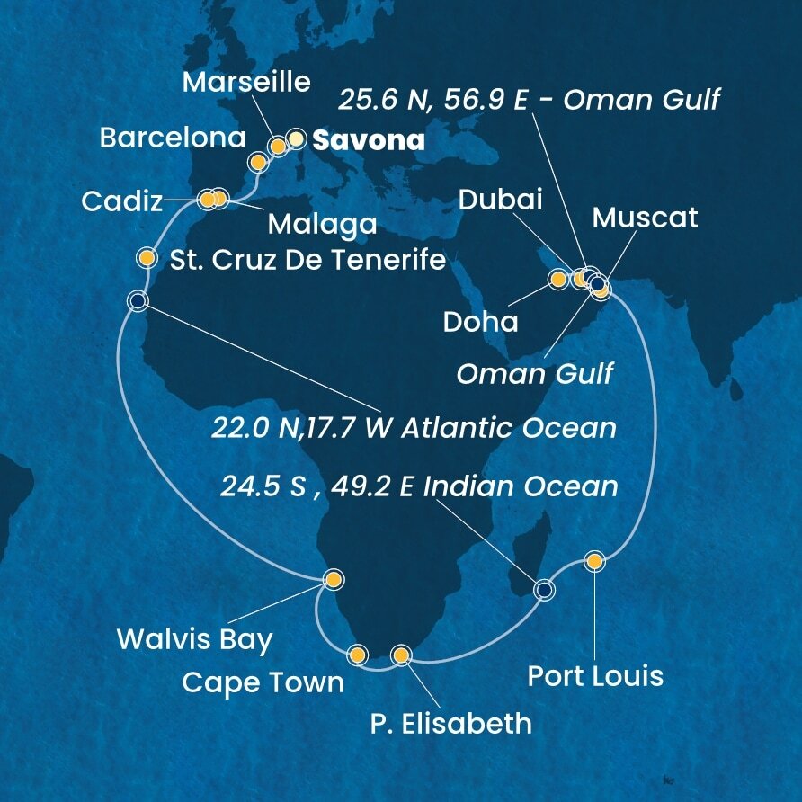 Африка Атлантическое побережье, 42 ночи Круиз из порта Савона, Италия в порт Доха, Катар