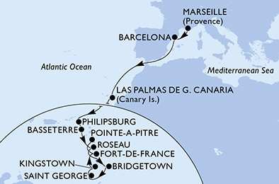 Карибы Восточные, 19 ночей Круиз из порта Марсель, Франция в порт Пуант-а-Питр, Гваделупа